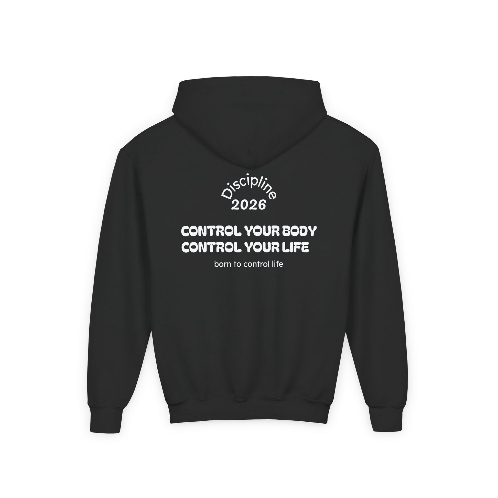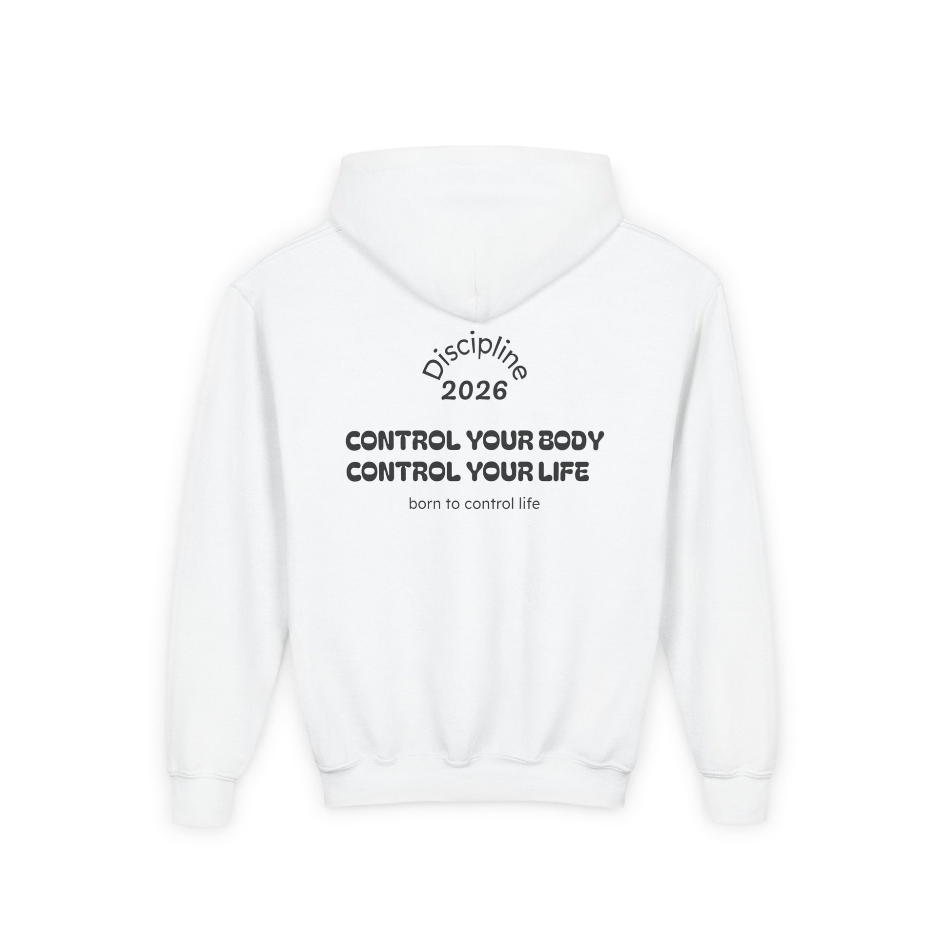 This youth hoodie is designed for focus, discipline, and daily effort. Featuring a clean white base with bold “CONSISTENCY” lettering on the chest and the motivational message “CONTROL YOUR BODY / CONTROL YOUR LIFE” on the back, it represents commitment and mindset.