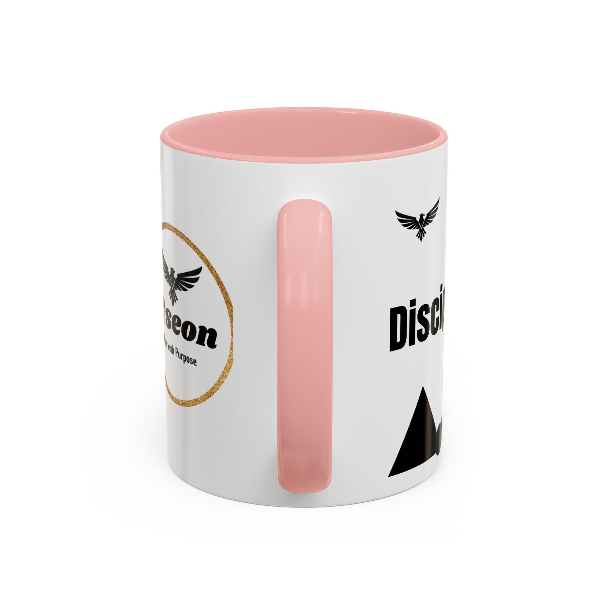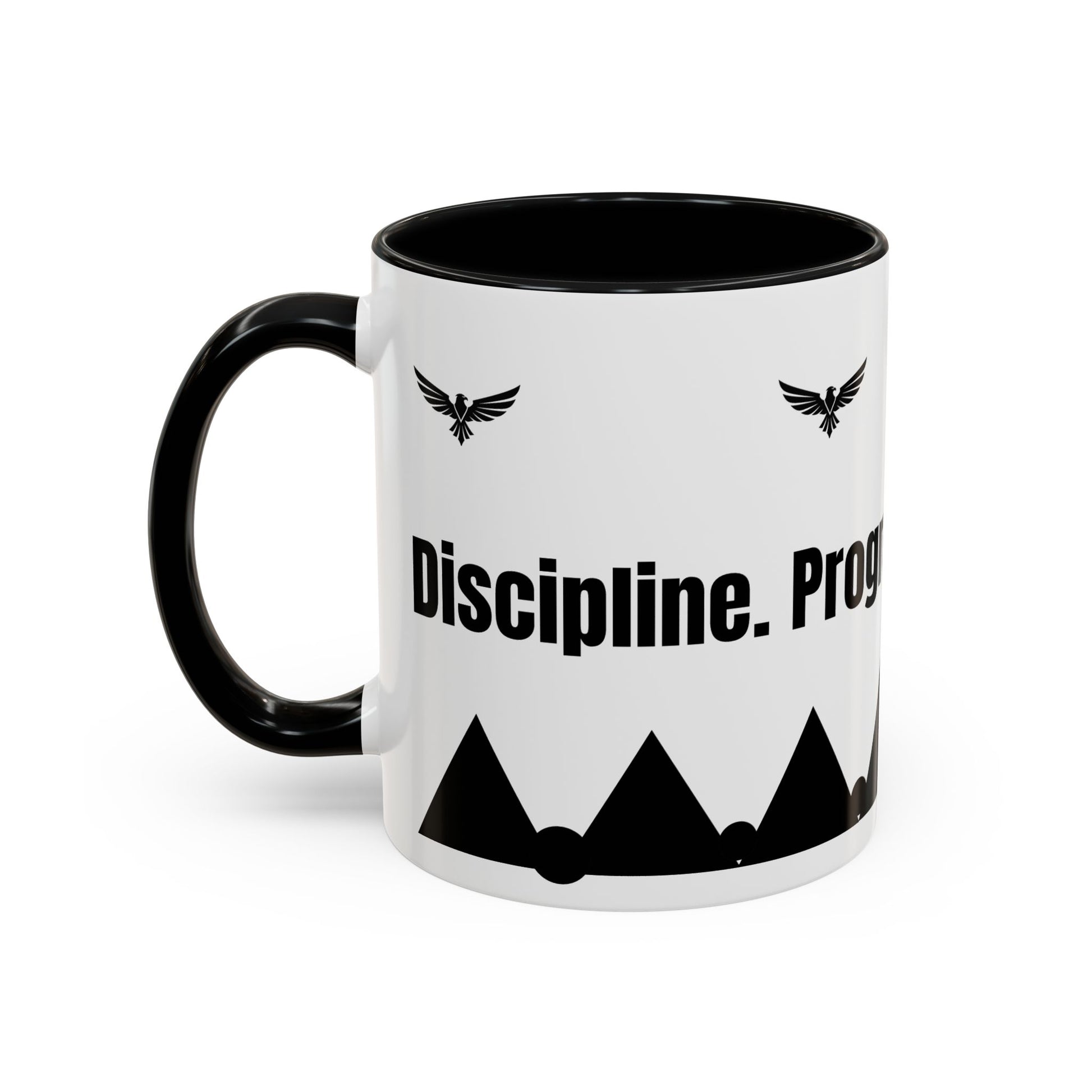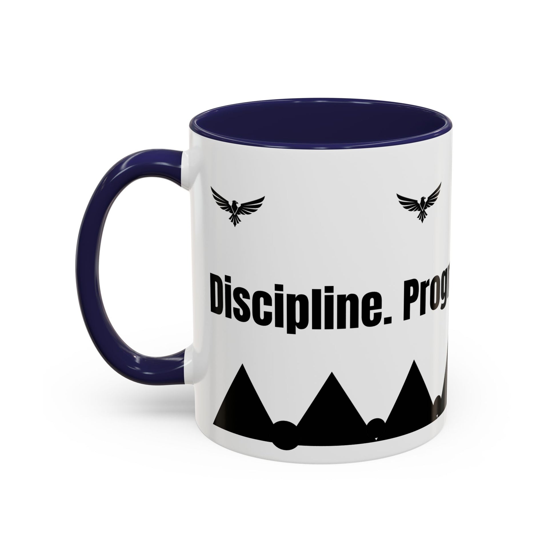 This bold ceramic mug is designed to bring focus and intention to your daily routine. Featuring a high-contrast colored interior and matching handle, it frames a crisp black-and-white design with rising mountains, a soaring emblem, and motivating words that subtly push you forward. The contrast draws the eye while maintaining a refined, purposeful aesthetic.